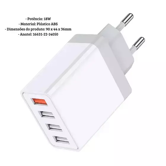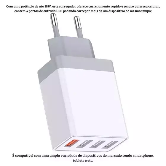Com uma potência de até 18W, este carregador oferece carregamento rápido e seguro para seu celular, contém 4 portas de entrada USB podendo carregar mais de um dispositivo ao mesmo tempo;